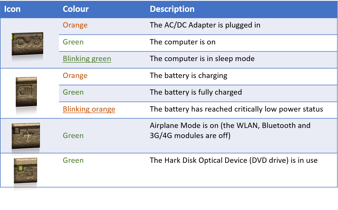 LED (Light Emitting Diodes) indicators are the small lights that are visible on the front of your computer. Depending on what colour they are and whether they are flashing or stationary, they can give you useful information about your laptop.